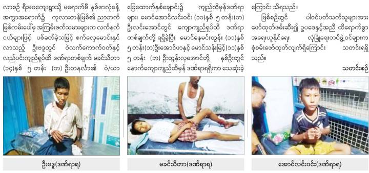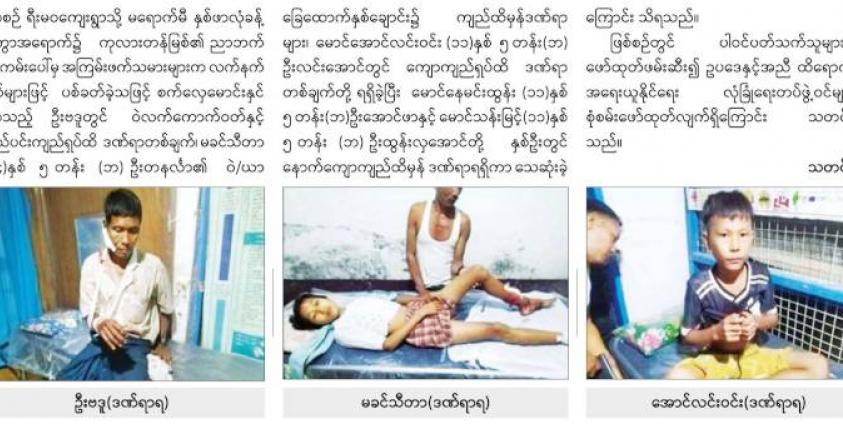 ယင်းအပြင် စက်လှေမောင်းနှင်လာသည့် ဦးဗဒူတွင် ဝဲလက်ကောက်ဝတ်နှင့် လည်ပင်းကျည်ရှပ် ထိဒဏ်ရာ တစ်ချက်၊ ပဥ္စမတန်းကျောင်းသူ မခင်သီတာ (၁၄ နှစ်)၏ ဝဲ/ယာခြေထောက်နှစ်ချောင်း၌ ကျည်ထိမှန်ဒဏ်ရာများ၊ ပဥ္စမတန်း ကျောင်းသား မောင်အောင်လင်းဝင်း (၁၁ နှစ်)တွင် ကျော ကျည်ရှပ်ထိ ဒဏ်ရာတစ်ချက်တို့ရရှိခဲ့သည်ဟုလည်း ရေးသားထားသည်။