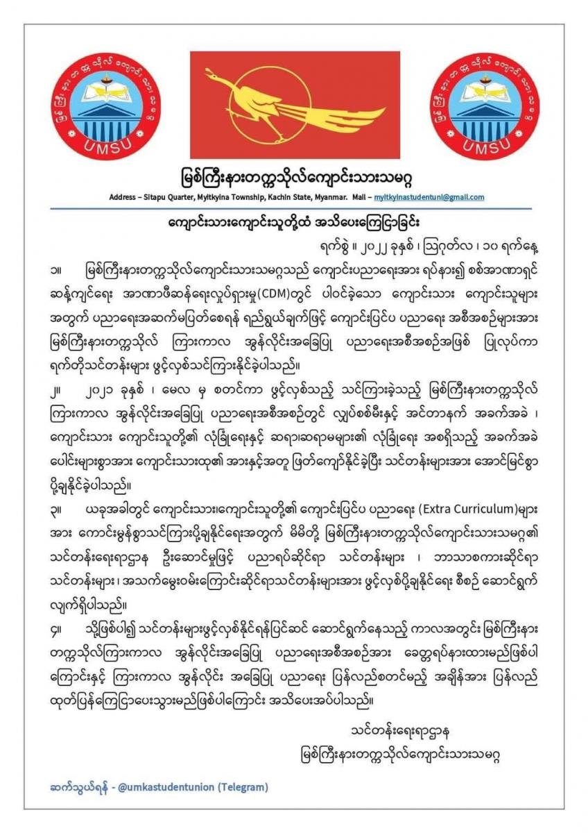 မြစ်ကြီးနားတက္ကသိုလ် ကျောင်းသားသမဂ္ဂကနေ ဖွင့်လှစ်သင်ကြားပေးနေတဲ့ အွန်လိုင်းအခြေပြု ကျောင်းပြင်ပပညာရေး ( Extra Curriculum ) အစီစဉ်ကို ဩဂုတ်လ (၁၀) ရက်နေ့ကနေစတင်ပြီး ခေတ္တရပ်နားသွားမှာဖြစ်တယ်လို့ သိရပါတယ်။