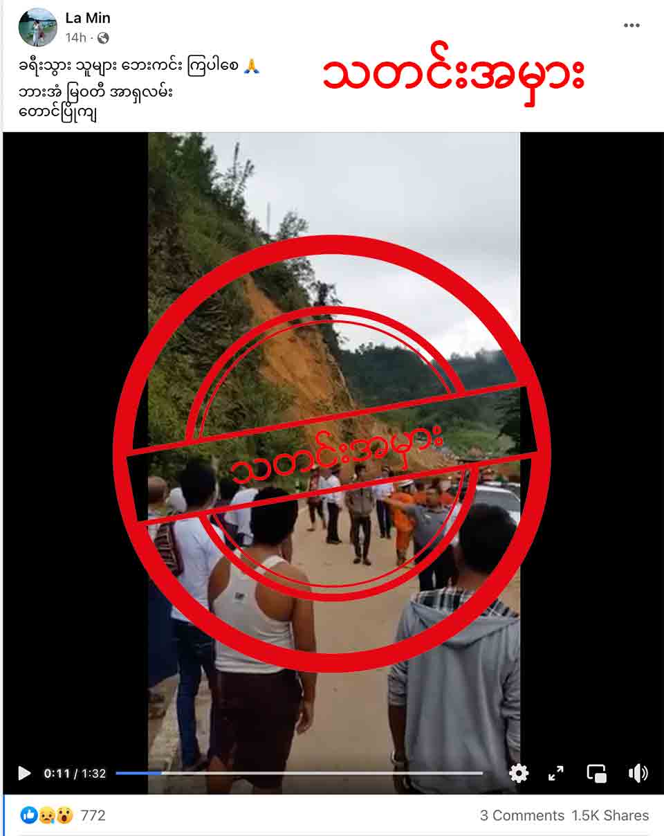ဘားအံ - မြဝတီ အာရှလမ်း တောင်ပြိုကျ တယ်ဆိုတဲ့ ရုပ်သံ သတင်းပို့စ် တစ်ခုကို La Min ဆိုသူ Facebook အကောင့်ပိုင်ရှင်က ဩဂုတ်လ ၁၂ ရက်နေ့မှာ တင်ထားတာကိုတွေ့ရပါတယ်။