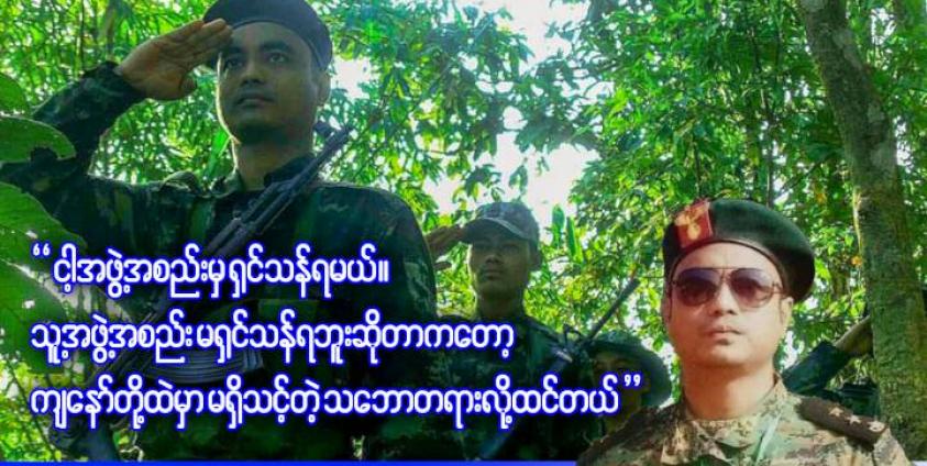 MT- အဲဒါက သူတို့ခေါင်းထဲမှာရှိတဲ့၊ သူတို့ရင်ထဲမှာရှိတဲ့ စကားကို သူတို့ပြောသွားတာဖြစ်တယ်။ ကျနော်တို့ အမြင်ကိုပြောရမယ်ဆိုရင်တော့ ရခိုင်ပြည်မှာ၊ ရခိုင်တော်လှန်ရေးထဲမှာ အမျိုးသားပါတီတစ်ရပ်တည်းသာ ရှိရမယ်။ အမျိုးသားတပ်မတော်တစ်ရပ်တည်းသာ ရှိရမယ်ဆိုတာက ရခိုင်တော်လှန်ရေးပါတီအဖွဲ့အစည်းတိုင်းရဲ့ မူဖြစ်တယ်။ သို့သော် ငါ့ပါတီမှရှိရမယ်။သူ့ပါတီ မရှိရ။ ငါ့အဖွဲ့အစည်းမှ ရှင်သန်ရမယ်။ သူ့အဖွဲ့အစည်း မရှင်သန်ရဆိုတာကတော့ ကျနော်တို့ထဲမှာ မရှိသင့်တဲ့သဘောတရားလို့ထင်တယ်။