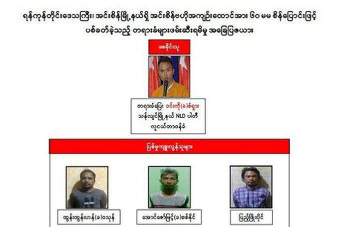 သြဂုတ်လ ၂၃ ရက်မှ ၂၆ ရက်နေ့အထိ တရားခံဟုစွပ်စွဲခံရသူ ကျား ခုနစ်ဦးနှင့် မ တစ်ဦးတို့အား မတူညီ သော နေရာဒေသများမှ ဖမ်းဆီးခဲ့ခြင်းဖြစ်ကြောင်း သိရသည်။