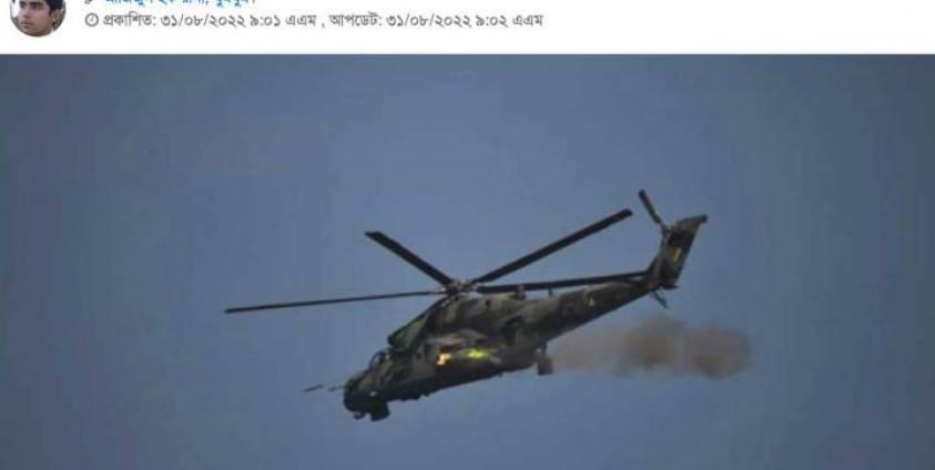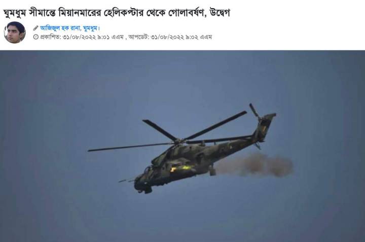 မြန်မာဘက်က စစ်ရဟတ်ယာဉ်တစ်စီးသည် ဘင်္ဂလားဒေ့ရှ် နိုင်ငံထဲကို ဖြတ်ကျော်ဝင်ရောက်ပြီး ပစ်ခတ်မှုများပြုလုပ်ခဲ့သည်ဟု ဘင်္ဂလာမီဒီယာများတွင် သတင်းဖော်ပြသည်။