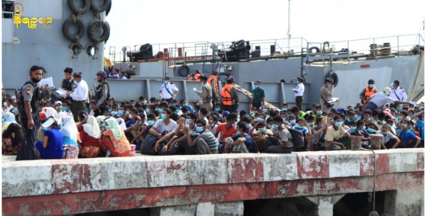 (ဓာတ်ပုံ - ရခိုင်ပြည်ပြင်ပတွင်ဖမ်းဆီးခံရသည့်မူဆလင်များအား ၂ဝ၂ဝ ပြည့်နှစ်၊ ဧပြီလအတွင်း အစိုးရက ရခိုင်ပြည်နယ်သို့ ပြန်လည်ပို့ဆောင်ခဲ့စဉ်။)