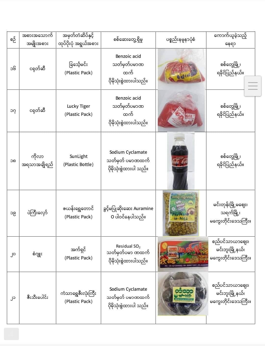 ပြီးခဲ့သည့် သြဂုတ်လ ၃၀ ရက်နေ့က FDA မှ ထုတ်ပြန်ကြေညာခဲ့သည့် စားသုံးရန်မသင့်သောအစားအသောက်များတွင် စစ်တွေမြို့မှ New Choice တံဆိပ် မက်မန်းသီးထုတ်၊ ABC (rainbow) တံဆိပ် စတော်ဘယ်ရီအရသာအချိုရည်၊ Sunlight တံဆိပ် ကိုလာအရသာအချိုရည်၊ ခြင်္သေ့မင်းတံဆိပ် ငရုတ်ဆီနှင့် Lucky Tiger တံဆိပ် ငရုတ်ဆီတို့ပါဝင်သည်။