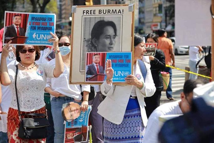 မဇ္ဈိမ။ ။ မြန်မာသံအမတ်ကြီး ဦးကျော်မိုးထွန်း UN တွင် ဆက်လက်တည်ရှိရေးအတွက် နယူးယောက်မြို့ UN ရုံးချုပ်ရှေ့သို့ မြန်မာတိုင်းရင်းသားပေါင်းစုံ ချီတက်ဆန္ဒပြခဲ့သည်။