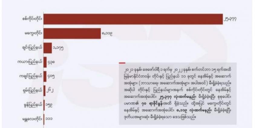 အဆိုပါထုတ်ပြန်ချက်တွင် ပြည်နယ်နှင့်တိုင်း (၁၁) ခု မှ နေအိမ်နှင့် အဆောက်အဦ (၃၆,၂၀၉ ) လုံး ဖျက်ဆီးခံရပြီး စစ်ကိုင်းတိုင်းတွင် (၂၅,၃၇၇) လုံး အထိဖျက်ဆီးခံရပြီး တစ်နိုင်ငံလုံး အရေအတွက်၏ (၇၀) ရာခိုင်နှုန်း အထိရှိကြောင်းဖော်ပြထားသည်။