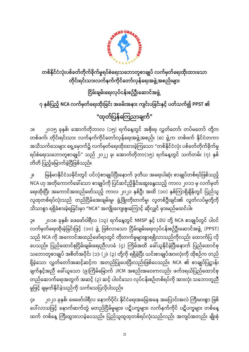 ဒီကနေ့ အောက်တိုဘာ ၁၅ ရက်နေ့မှာ ကျရောက်တဲ့ တစ်နိုင်ငံလုံးပစ်ခတ်တိုက်ခိုက်မှု ရပ်စဲရေးဆိုင်ရာ သဘောတူစာချုပ် (NCA) လက်မှတ်ရေးထိုးမှု ၇ နှစ်ပြည့်နေ့မှာ PPST က သဘောထား ထုတ်ပြန်လိုက်တာပါ။