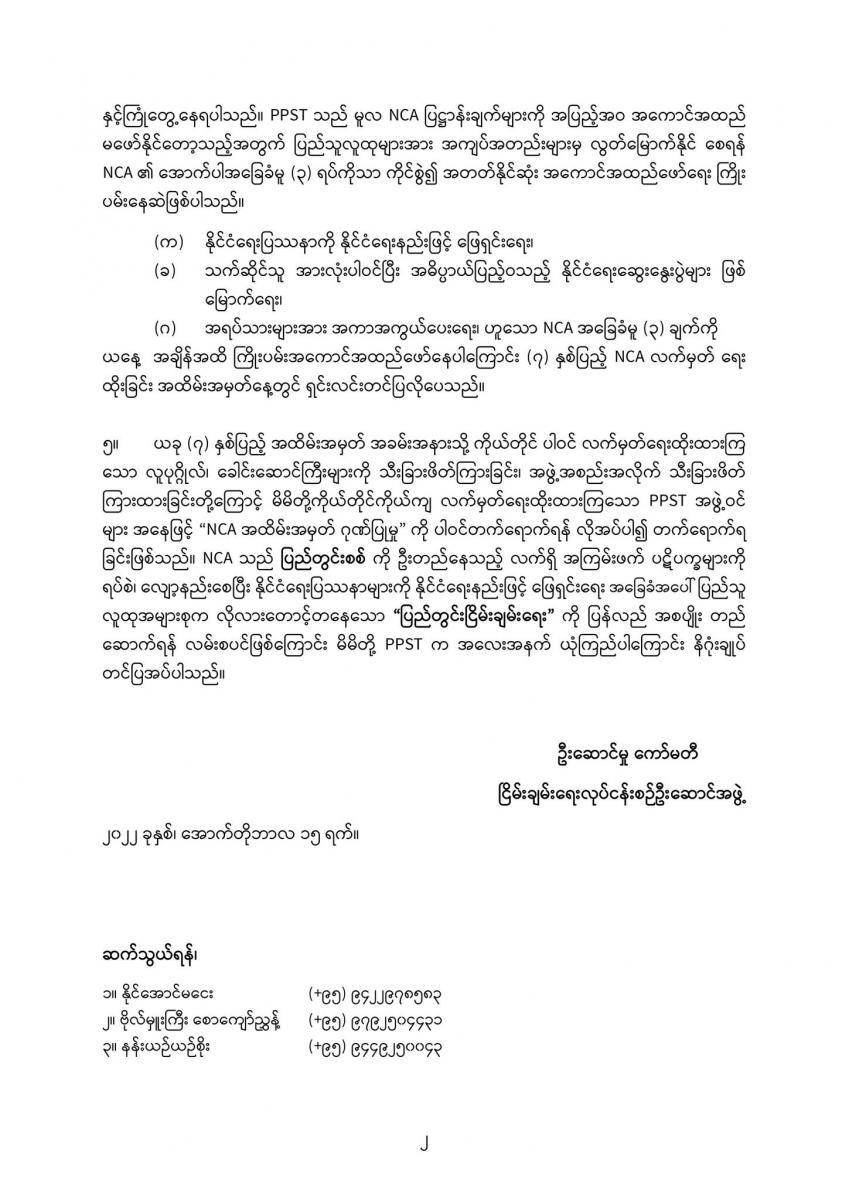ဒါ့အပြင် NCA ဟာ ပြည်တွင်းစစ်ကို ဦးတည်နေတဲ့ လက်ရှိ ပဋိပက္ခတွေကို ရပ်စဲလျော့နည်းစေပြီး လူထုအများစု လိုလားတောင့်တနေတဲ့ ပြည်တွင်းငြိမ်းချမ်းရေးကို ပြန်လည်အစပျိုးတည်ဆောက်ဖို့ လမ်းစဖြစ်တယ်လို့ PPST ရဲ့ ထုတ်ပြန်ချက်မှာ ဖော်ပြထားပါတယ်။