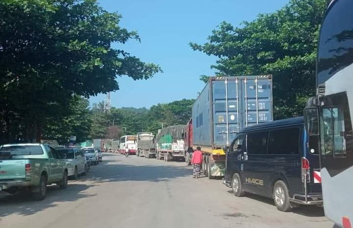 ကော့ကရိတ်-မြဝတီ အာရှလမ်းမပေါ်၌ ယနေ့ တိုက်ပွဲဖြစ်ပွားနေမှုကြောင့်ကားများ ပိတ်မိနေစဉ်။ ဓာတ်ပုံ - CJ