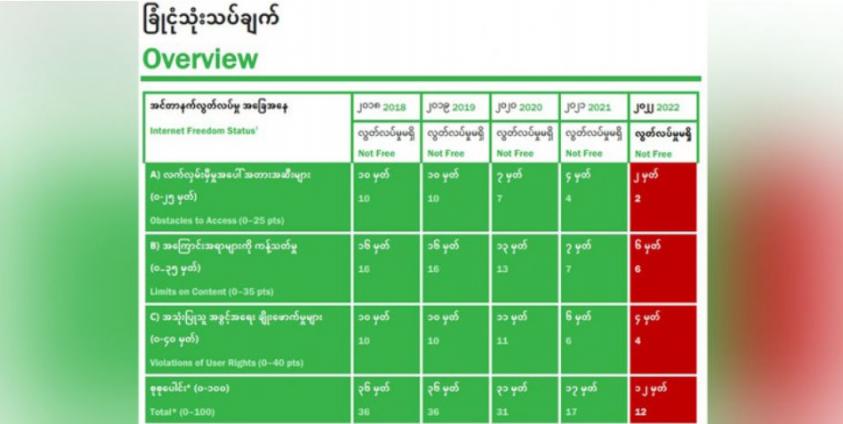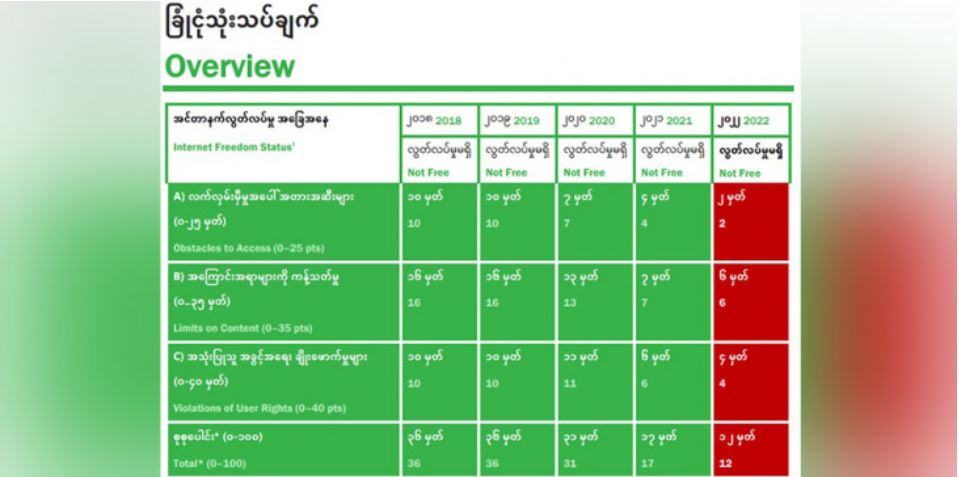 ၂၀၂၂ ခုနှစ် ကမ္ဘာ့အင်တာနက်လွတ်လပ်ခွင့် အစီရင်ခံစာမှာ ဒါဇင်နဲ့ ချီတဲ့ အညွှန်းကိန်းတွေကို အသုံးပြုပြီး ကမ္ဘာ့နိုင်ငံတွေကို နှိုင်းယှဉ်လေ့လာချက်အရ မြန်မာနိုင်ငံရှိ အင်တာနက်လွတ်လပ်ခွင့်ကဏ္ဍဟာ စုစုပေါင်း ရမှတ် ၁၀၀ အနက် အာဏာသိမ်းပြီး ပထမနှစ် ၂၀၂၁ခုနှစ်မှာ ရရှိခဲ့တဲ့ ရမှတ် ၁၇ မှတ်ကနေ ၂၀၂၂ ခုနှစ်အတွင်း ဆက်တိုက်ကျဆင်းလာပြီး ရမှတ် ၁၂ မှတ်သာ ရရှိတော့တာပါ။