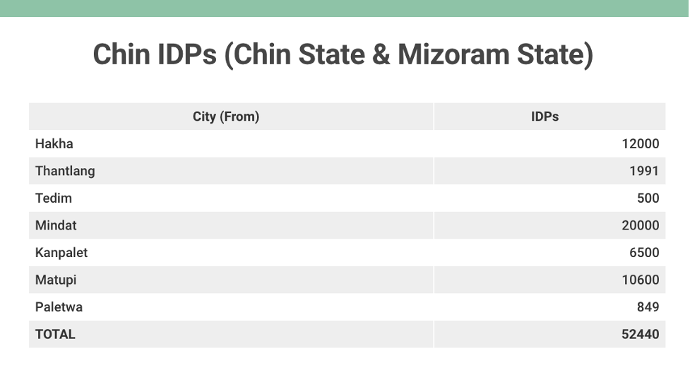 သတင်းမီဒီယာတွေရဲ့ ဖော်ပြချက်ကနေ ကောက်ယူထားတဲ့ အချက်အလက်အရ ချင်းပြည်နယ်အတွင်းမှာကော မီဇိုရမ်ပြည်နယ်အတွင်းမှာပါ စစ်ဘေးရှောင်နေရတဲ့ပြည်သူ စုစုပေါင်း ၅၂,၄၄၀ ရှိနေပြီလို့ BNI-Myanmar Peace Monitoring Website (https://www.mmpeacemonitor.org/) အချက်အလက်အရ သိရပါတယ်။