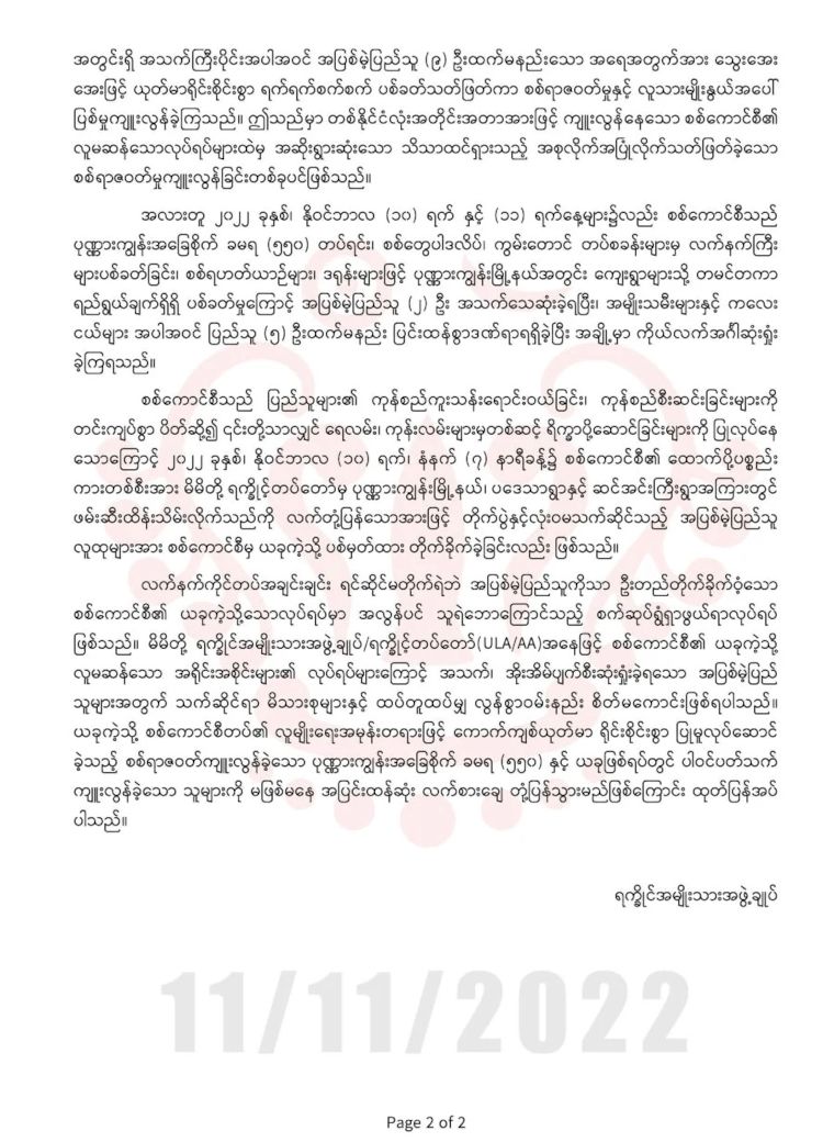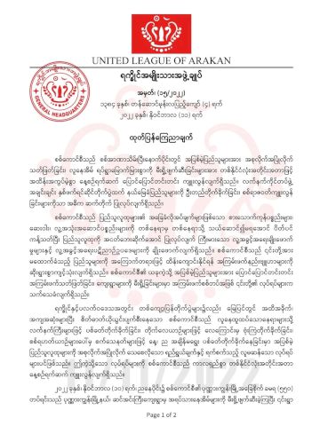 လက်နက်ကိုင်တပ်အချင်းချင်း ရင်ဆိုင်မတိုက်ရဲဘဲ အပြစ်မဲ့ပြည်သူကိုသာ ဦးတည်တိုက်ခိုက်ဝံ့သော စစ်ကောင်စီ၏ ယခုကဲ့သို့သောလုပ်ရပ်မှာ အလွန်ပင် သူရဲဘောကြောင်သည့် စက်ဆုပ်ရွံရှာဖွယ်ရာလုပ်ရပ် ဖြစ်ကြောင်း၊ မိမိတို့ ရက္ခိုင်အမျိုးသားအဖွဲ့ချုပ်/ ရက္ခိုင့်တပ်တော် (ULA/AA)အနေဖြင့် စစ်ကောင်စီ၏ ယခုကဲ့သို့ လူမဆန်သော အရိုင်းအစိုင်းများ၏ လုပ်ရပ်များကြောင့် အသက်၊ အိုးအိမ်ပျက်စီးဆုံးရှုံးခဲ့ရသော အပြစ်မဲ့ပြည် သူများအတွက် သက်ဆိုင်ရာ မိသားစုများနှင့် ထပ်တူထပ်မျှ လွန်စွာဝမ်းနည်း စိတ်မကောင်းဖြစ်ရပါကြောင်း ဆက်လက်ဖော်ပြသည်။