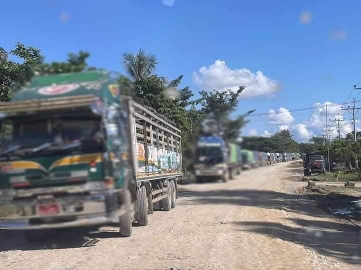 Photo - ဖားကန့်လမ်း နန့်ယားကျေးရွာတွင် ပိတ်ဆို့ခံထားရသည့် ကုန်တင်ကားများ