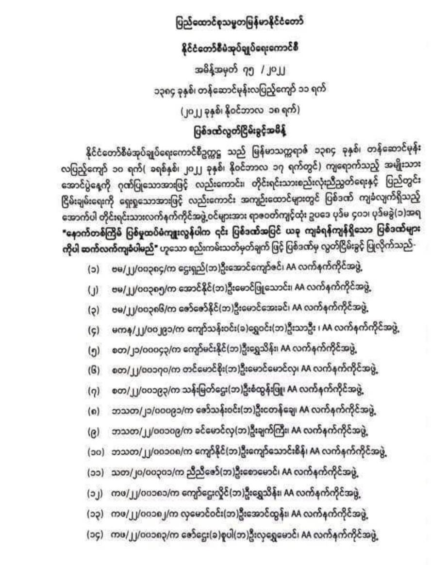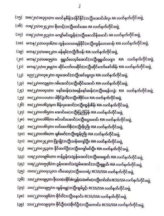 စစ်ကောင်စီ၏ ပြစ်ဒဏ်လွတ်ငြိမ်းခွင့်အမိန့်တွင် ရက္ခိုင့်တပ်တော် (AA) က ၁၇ ဦး၊ ကချင်လွတ်မြောက်ရေးတပ်မတော် (KIA) က ၁၇ ဦး၊ သျှမ်းပြည်ပြန်လည်ထူထောင်ရေးကောင်စီ RCSS/SSA က ၅ ဦးနှင့် ကရင်အမျိုးသား အစည်းအရုံးက KNU/KNLA က ၂ ဦးပါဝင်သည်။