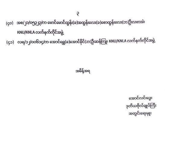 ပြစ်ဒဏ်လွတ်ငြိမ်းခွင့်အမိန့်တွင် “နိုင်ငံတော်ကောင်စီ ဥက္ကဋ္ဌသည် မြန်မာသက္ကရာဇ်၁၃၈၄ ခုနှစ် တန်ဆောင်မုန်း လပြည့်ကျော် ၁၀ ရက် (ခရစ်နှစ် ၂၀၂၂ ခုနှစ်၊ နိုဝင်ဘာ ၁၇ ရက်) တွင် ကျရောက်သည့် အမျိုးသား အောင်ပွဲနေ့ကို ဂုဏ်ပြုသောအားဖြင့်လည်းကောင်း၊ တိုင်းရင်းသား စည်းလုံးညီညွတ်ရေးနှင့် ပြည်တွင်းငြိမ်းချမ်းရေးကို ရှေးရှုသော အားဖြင့်လည်းကောင်း အကျဉ်းထောင်များတွင် ပြစ်ဒဏ်ကျခံလျက်ရှိသည့် တိုင်းရင်းသားလက်နက်ကိုင် အဖွဲ့ဝင်များအား ရာဇဝတ်ကျင့်ထုံး ဥပဒေပုဒ်မ ၄၀၁၊ ပုဒ်မခွဲ (၁) အရ “ နောက်တစ်ကြိမ် ပြစ်မှု ထပ်မံကျူးလွန်ပါက ၎င်းပြစ်ဒဏ်အပြင် ယခုကျခံရန် ကျန်ရှိသော ပြစ်ဒဏ်များကိုပါ ဆက်လက်ကျခံပါမည်” ဟူသော စည်းကမ်းသတ်မှတ်ချက်ဖြင့် ပြစ်ဒဏ်မှ လွတ်ငြိမ်းခွင့်ပြုလိုက်သည်။” ဟုပါရှိသည်။