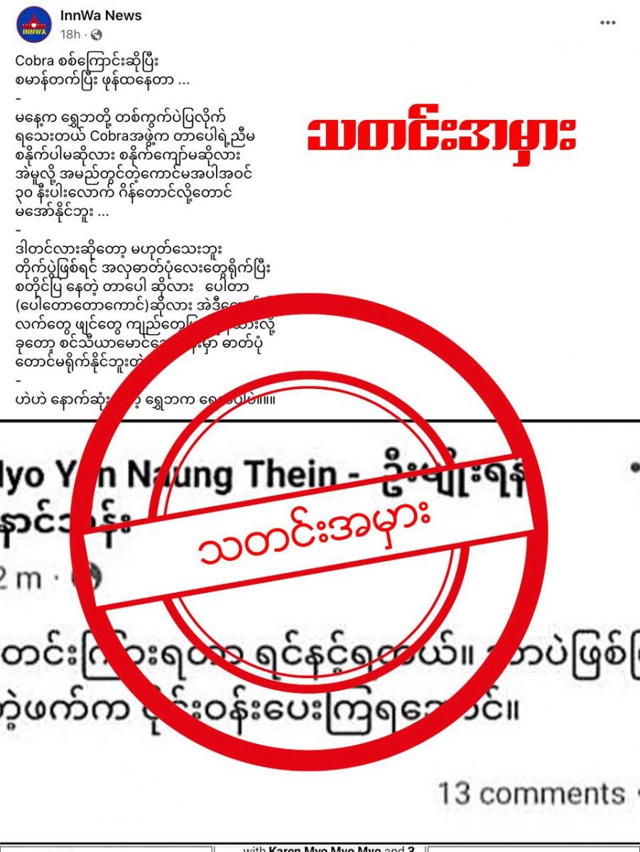 ဒါကြောင့် အချက်အလက်တွေကို တိုက်ကြည့်လိုက်တဲ့အခါမှာ InnWa News ဆိုတဲ့ Facebook စာမျက်နှာက မြေ ပြင်မှာ ဖြစ်ပျက်ခဲ့တဲ့ အချက်အလက်တွေကို အခြေမခံမပဲ ဝါဒဖြန့်ဖို့အတွက်အချက်အလက်အမှားတွေကို လုပ် ကြံဖန်တီးပြီး လိမ်ညာ ရေးသားထားတဲ့ သတင်းအမှား တစ်ခုသာ ဖြစ်ပါတယ်။