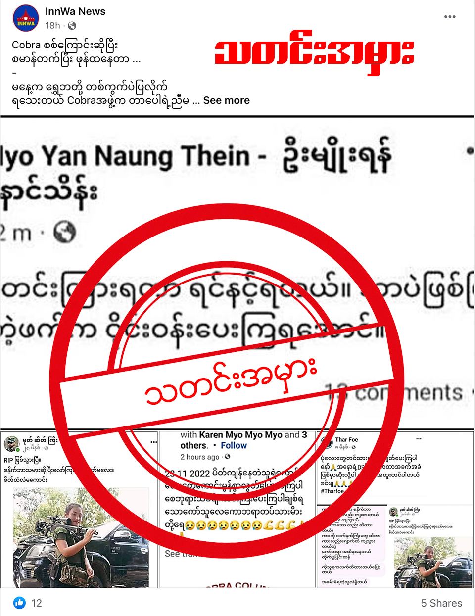 InnWa News က “Cobra စစ်ကြောင်းဆိုပြီး စမာန်တက်ပြီး ဖုန်ထနေတာ..မနေ့က ရွှေဘတို့ တစ်ကွက်ပဲပြလိုက်ရသေးတယ်။ Cobra အဖွဲ့က တာပေါရဲ့ ညီမ စနိုက်ပါမဆိုလား စနိုက်ကျော်မဆိုလား အဲမူလို့ အမည်တွင် တဲ့ ကောင်မအပါအဝင် ၃၀ နီးပါးလောက်ဂိန်တောင်လို့တောင်မအော်နိုင်ဘူး..ဒါတင်လားဆိုတော့ မဟုတ်သေး ဘူး တိုက်ပွဲဖြစ်ရင်အလှဓာတ်ပုံလေးတွေရိုက်ပြီး စတိုင်ပြနေတဲ့ တာပေါ ဆိုလား ပေါတာ (ပေါတောတော ကောင်) ဆိုလား အဲဒီကောင်ပါ လက်တွေ ဖျင်တွေ ကျည်တွေ ဖြတ်မှန်ထားလို့ ခုတော့ စင်သီယာမောင် ဆေးခန်း မှာ ဓာတ်ပုံ တောင်မရိုက်နိုင်ဘူးတဲ့ ...ဟဲဟဲ နောက်ဆုံးတော့ ရွှေဘက ရွှေဘပါပဲ” ဆိုပြီး (မူရင်း အရေးအသား အတိုင်း) ရေးသားထားပါတယ်။