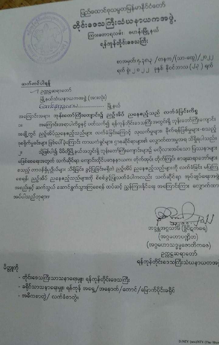 ရန်ကုန်တိုင်းဒေသကြီးသံဃနာယကအဖွဲ့က စာအမှတ် (၄-၃၈၃/တနက/(သာ-ထွေ)/၂၀၂၂ နဲ့ နိုဝင်ဘာ ၂၃ရက်နေ့စွဲနဲ့ တားမြစ်ချက်ထုတ်ပြန်လိုက်တာပါ။