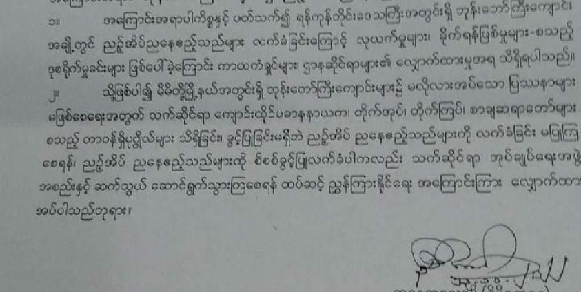 သက်ဆိုင်ရာ ဘုန်းတော်ကြီးကျောင်းတွေက ကျောင်းထိုင်၊တိုက်အုပ်၊တိုက်ကြပ်နဲ့ စာချ ဆရာတော်တွေ မသိဘဲ ညအိပ်ဧည့်သည်လက်မခံဖို့နဲ့ စိစစ်ပြီးမှလက်ခံဖို့၊ လက်ခံထားတဲ့ဧည့်သည်ရှိလာရင်လည်း ရပ်ကွက် အုပ်ချုပ်ရေးမှူးရုံးကို အကြောင်းကြားဖို့ စတဲ့အချက်တွေကို အဲဒီထုတ်ပြန်ချက်မှာ ပါရှိပါတယ်။