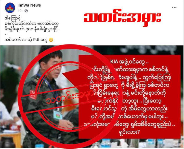 ဒါကြောင့်အချက်အလက်တွေ တိုက်စစ်ကြည့်လိုက်တဲ့အခါမှာ InnWa News ဆိုတဲ့ Facebook စာမျက်နှာက ကချင်တိုင်းရင်းသားတွေနဲ့ ဗမာ၊ ရှမ်းတိုင်းရင်းသားတွေကို လူမျိုးရေး ပဋိပက္ခဖြစ်အောင်၊ ဗမာ နဲ့ ရှမ်းတိုင်းရင်း သားတွေက NUG ၊ PDF နဲ့ တိုင်းရင်းသား လက်နက်ကိုင် အဖွဲ့အစည်းတွေကို မုန်းတီးအောင်၊ ပဋိပက္ခဖြစ်အောင် ဝါဒဖြန့်ဖို့အတွက် တမင် ရည်ရွယ်ချက် ရှိရှိ လုပ်ကြံဖန်တီး ရေးသားထားတဲ့ သတင်းအမှားတစ်ခုသာ ဖြစ်ပါ တယ်။