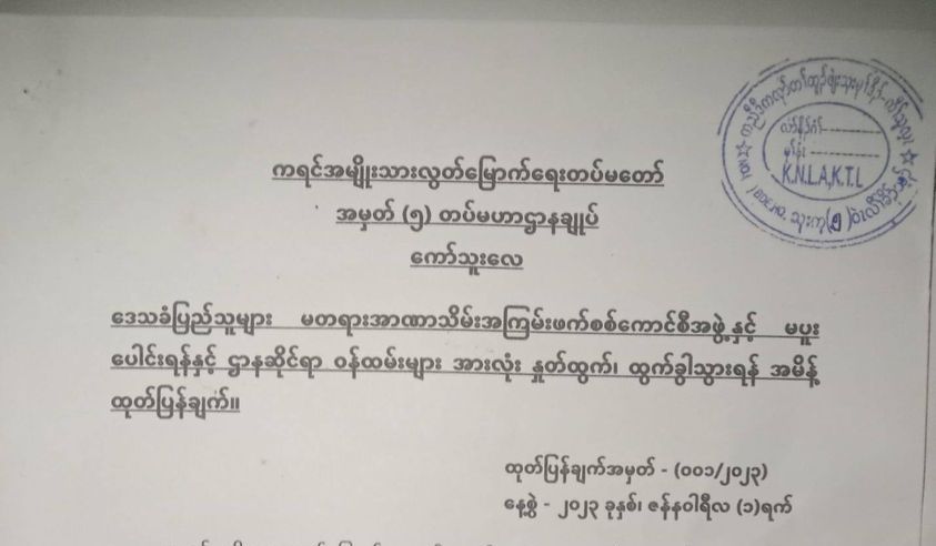 ကရင်အမျိုးသားလွတ်မြောက်ရေးတပ်မတော် KNLA တပ်မဟာ(၅) သတ်မှတ်ထိန်းချုပ်နယ်မြေဖြစ်တဲ့ ဖာပွန်၊ ကမမောင်းမြို့နဲ့ ရပ်ကွက်ကျေးရွာတွေက ဒေသခံပြည်သူတွေအနေနဲ့ စစ်ကောင်စီအဖွဲ့နဲ့ မပူးပေါင်းဖို့၊ ဌာနဆိုင် ရာဝန်ထမ်းတွေ အားလုံး နှုတ်ထွက်ထွက်ခွာသွားဖို့ အမိန့်ထုတ်ပြန်ချက်တစ်ရပ်ကို တပ်မဟာ(၅)က ဇန်နဝါရီ လ(၁)ရက်နေ့ ရက်စွဲနဲ့ ထုတ်ပြန်ကြေညာထားပါတယ်။