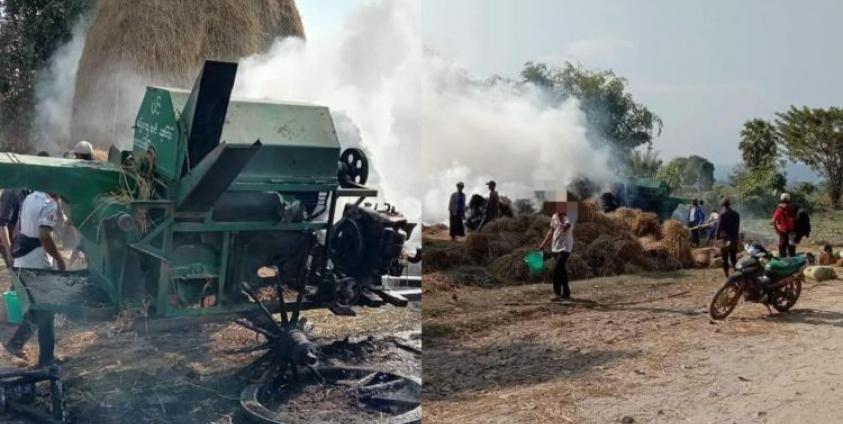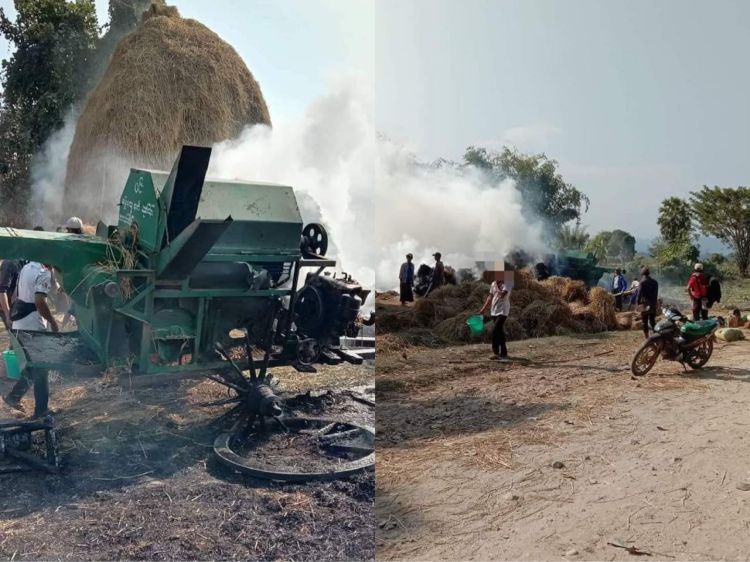 ကောက်လှိုင်းပုံထဲတွင် စစ်ကောင်စီထောင်ထားသည့်မိုင်းပေါက်ကွဲ၍ စပါးချွေနေသည့်ပြည်သူတစ်ဦး မိုင်းစထိမှန်