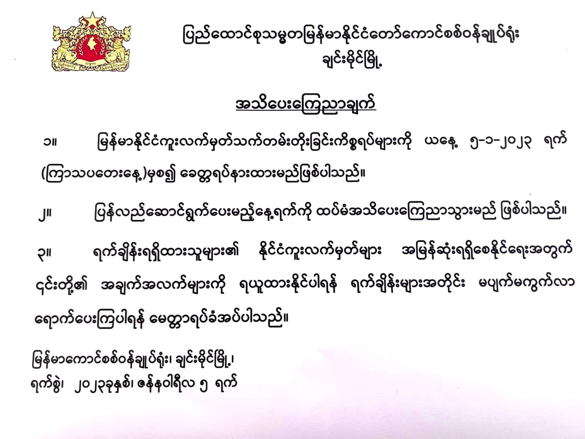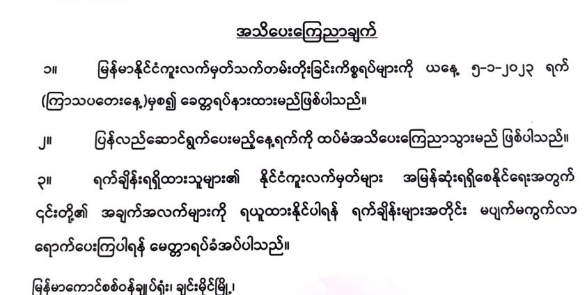 နိုင်ငံကူးလက်မှတ်လျှောက်ထားသူတွေကို အရင်က အွန်လိုင်း Booking စနစ်နဲ့ ရန်ကုန်ရုံးမှာ လျှောက်ထားရပေမယ့် ၂၀၂၂ ခုနှစ် ဒီဇင်ဘာလဆန်းပိုင်းမှာ ရပ်နားခဲ့ပြီး Booking QR Code ရရှိထားသူတွေကိုသာ ဆက်လက်လုပ်ဆောင်ပေးသွားတော့မှာဖြစ်တယ်လို့ နိုင်ငံကူးလက်မှတ် ထုတ်ပေးရေးရုံးက အသိပေးထားပါတယ်။