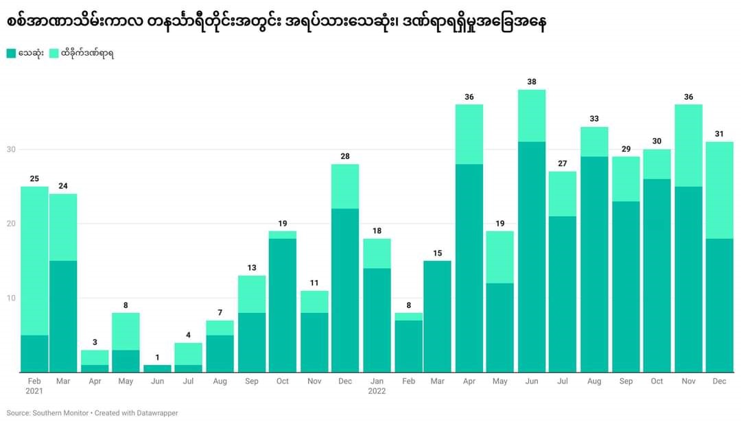 စစ်အာဏာသိမ်းကာလအတွင်း တနင်္သာရီတိုင်းတွင် အရပ်သားသေဆုံးမှု ၃၃၅ ဦးရှိပြီး ၎င်းထဲတွင် အမျိုးသမီး ၁၅ ရာခိုင်နှုန်းပါဝင်သည်ဟု Southern Monitor က ထုတ်ပြန်ထားချက်အရ သိရသည်။