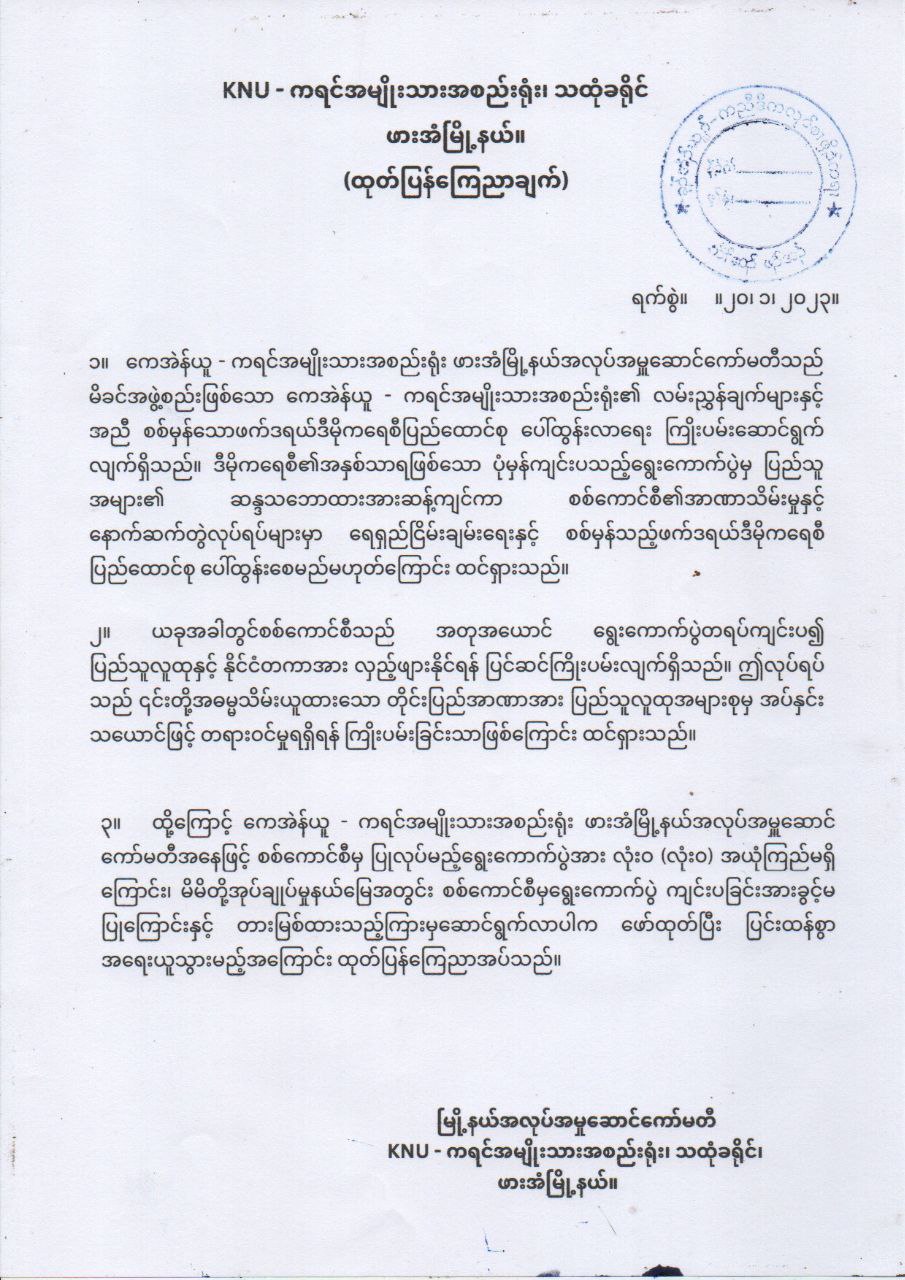 စစ်ကောင်စီက ကျင်းပပြုလုပ်မည့် ရွေးကောက်ပွဲအား အယုံအကြည်မရှိ၍ သထုံခရိုင်အတွင်း ရွေးကောက်ပွဲ ကျင်းပခွင့်မပြုကြောင်း KNU -ကရင်အမျိုးသားအစည်းအရုံး ဖားအံမြို့နယ် အလုပ်အမှုဆောင်ကော်မတီက ယမန်နေ့က ထုတ်ပြန်ကြေညာလိုက်သည်။