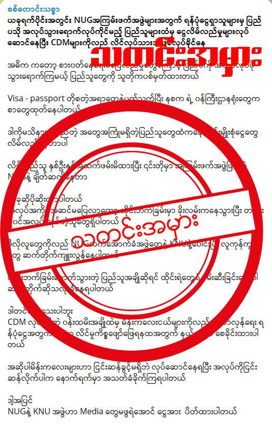 “ယခုရက်ပိုင်းအတွင်း NUG အကြမ်းဖက် အဖွဲများအတွက် ရန်ပုံငွေရှာသူများမှ ပြည်ပသို့ အလုပ်သွားရောက် လုပ်ကိုင်မည့် ပြည်သူများထံမှ ငွေလိမ်လည်မှုများလုပ်ဆောင်နေပြီး CDM များကိုလည်း လိင်လုပ်သားအဖြစ် လုပ်ခိုင်းနေ” ဆိုတဲ့ ခေါင်းစဉ်နဲ့ ရေးသားထားပြီး အဲဒီအထဲမှာ အခုလိုထည့်သွင်း ရေးသားထားတာပါ။