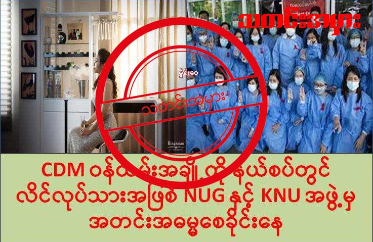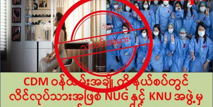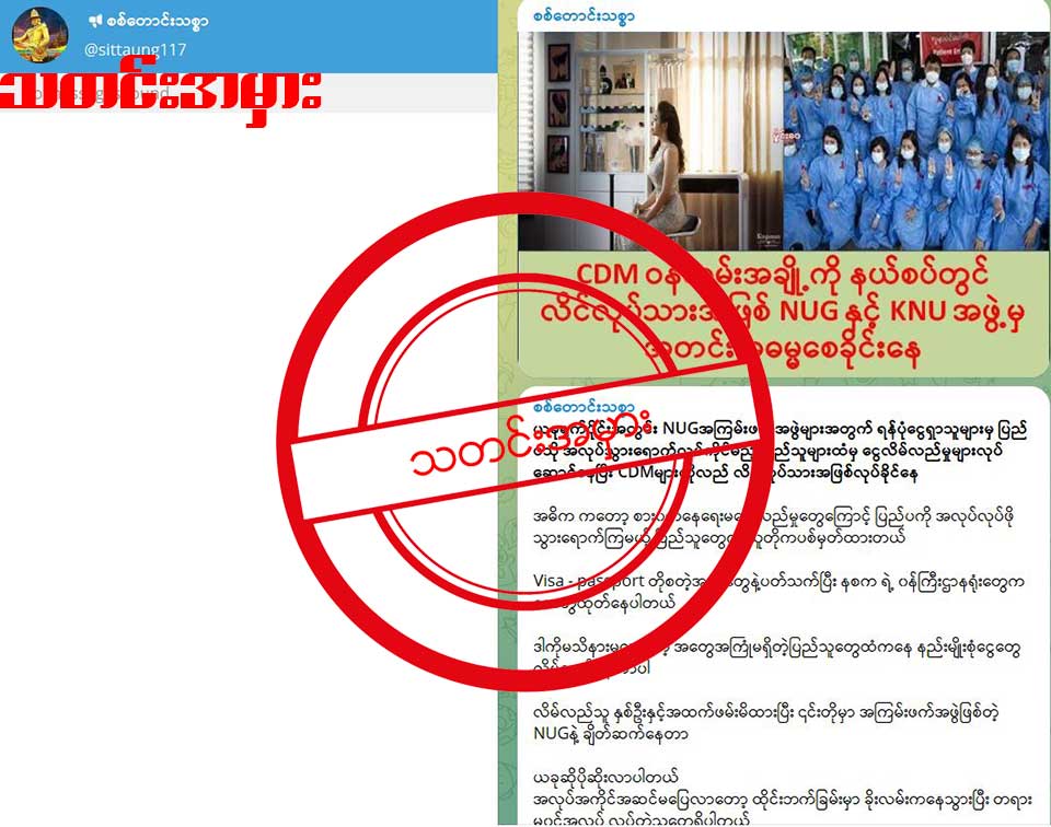 CDM လုပ်တဲ့ အမျိုးသမီး ဝန်ထမ်းတချို့ကို NUG နဲ့ KNU က တော်လှန်ရေး ရန်ပုံငွေအတွက်ဆိုပြီး လိင်လုပ်သား အဖြစ် အတင်းအဓမ္မ စေခိုင်းနေတယ်ဆိုတဲ့ သတင်းအမှား တစ်ခုကို စစ်တောင်းသစ္စာ ဆိုတဲ့ တယ်လီဂရမ် အကောင့်ကနေ ဇန္နဝါရီလ ၁၈ ရက်နေ့က တင်ထားပါတယ်။