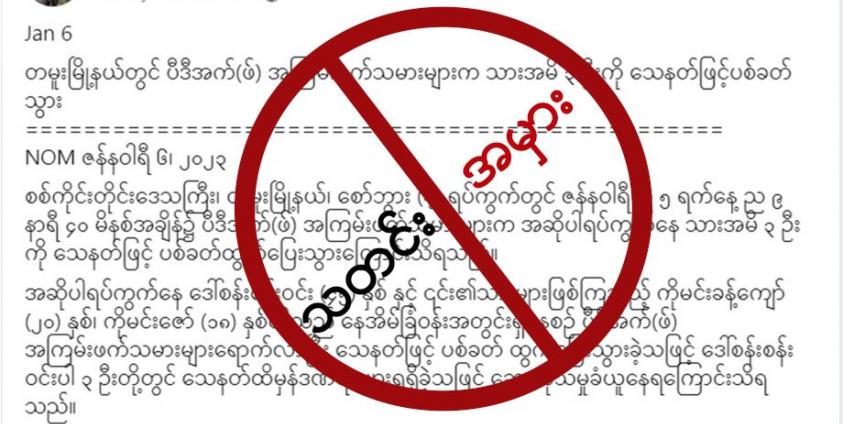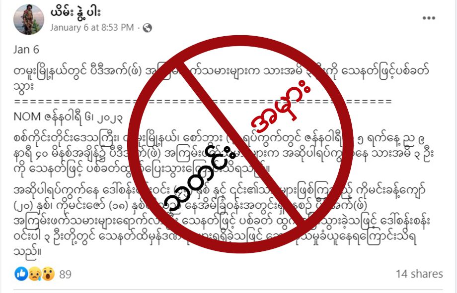ဒီသတင်းအမှားကို ယိမ်းနွဲ့ပါး ဆိုတဲ့အကောင့်ကနေပြီး “စစ်ကိုင်းတိုင်းဒေသကြီး၊ တမူးမြို့နယ်၊ စော်ဘွား (၇) ရပ်ကွက်တွင် ဇန်နဝါရီလ ၅ ရက်နေ့ ည ၉ နာရီ ၄၀ မိနစ်အချိန်၌ ပီဒီအက်(ဖ်) အကြမ်းဖက်သမားများက အဆိုပါရပ်ကွက်နေ သားအမိ ၃ ဦးကို သေနတ်ဖြင့် ပစ်ခတ်ထွက်ပြေးသွားကြောင်းသိရသည်။” လို့ရေးသားထားပါတယ်။
