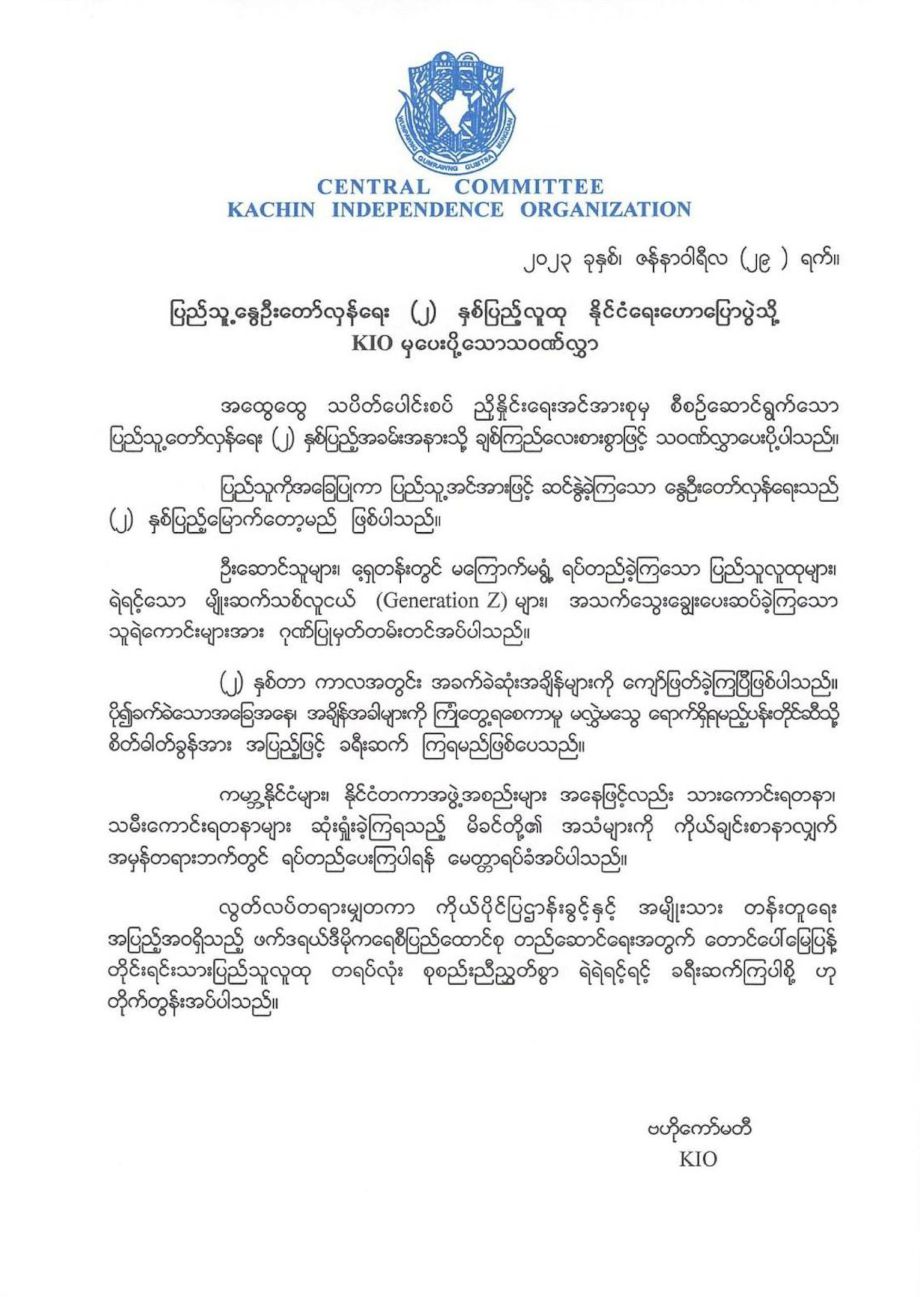 လွတ်လပ်တရားမျှတကာ ကိုယ်ပိုင်ပြဌာန်းခွင့်နဲ့ အမျိုးသားတန်းတူရေး အပြည့်အဝရှိတဲ့ ဖက်ဒရယ် ဒီမိုကရေစီ ပြည်ထောင်စု တည်ဆောက်ရေးအတွက် တောင်ပေါ်မြေပြန့် တိုင်းရင်းသားပြည်သူလူထု တရပ်လုံး စုစည်းညီညွတ်စွာ ရဲရဲရင့်ရင့် တော်လှန်ကြဖို့ KIO ရဲ့ သဝဏ်လွှာမှာဖော်ပြထားပါတယ်။