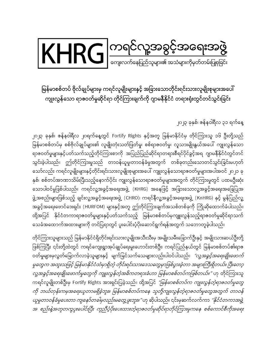 မြန်မာစစ်ဗိုလ်ချုပ်များ၏ ကျူးလွန်မှုများအပေါ် Fortify Rights နှင့် မြန်မာနိုင်ငံသားများပါဝင်သည့် တိုင်ကြားမှု KHRG ကြိုဆိုထောက်ခံ