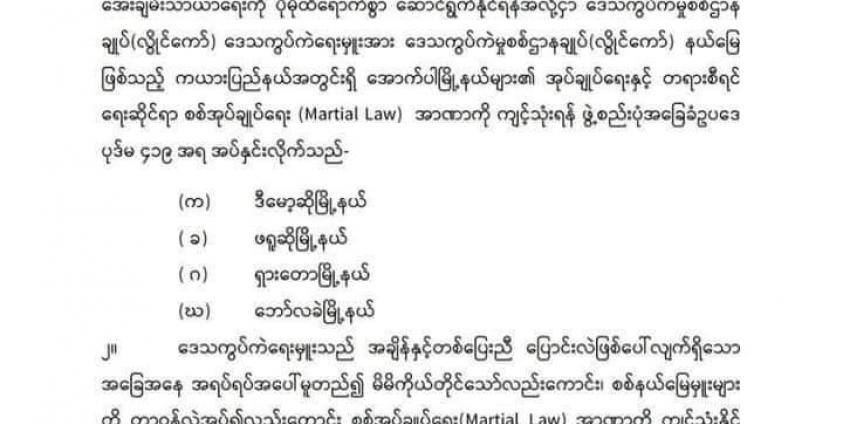 စစ်ကောင်စီက ကရင်နီပြည်က ( ၄ ) မြို့နယ်အပါအဝင် စစ်ကိုင်းတိုင်းက ( ၁၁ ) မြို့နယ်၊ ချင်းပြည်နယ်က ( ၈ ) မြို့နယ်၊ ပဲခူးတိုင်းဒေသကြီးက ( ၅ ) မြို့နယ်၊ မကွေးတိုင်းဒေသကြီးက ( ၅ ) မြို့နယ်ကို စစ်အုပ်ချုပ်ရေး ကြေညာထားပါတယ်။