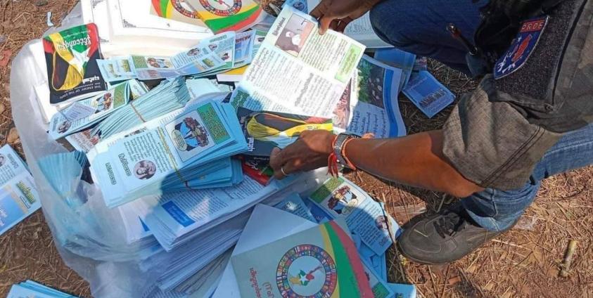 ခရီးသည်တင် မှန်လုံကားပေါ်မှ စစ်ကောင်စီ၏ ဝါဒဖြန့် စာစဉ်များကို သိမ်းဆည်းရမိပြီးနောက် မီးရှို့ဖျက်ဆီးခဲ့သည်ဟု ပုလောဒေသ ကာကွယ်ရေးတပ်ဖွဲ့ PRDF တာဝန်ရှိသူက ပြောသည်။