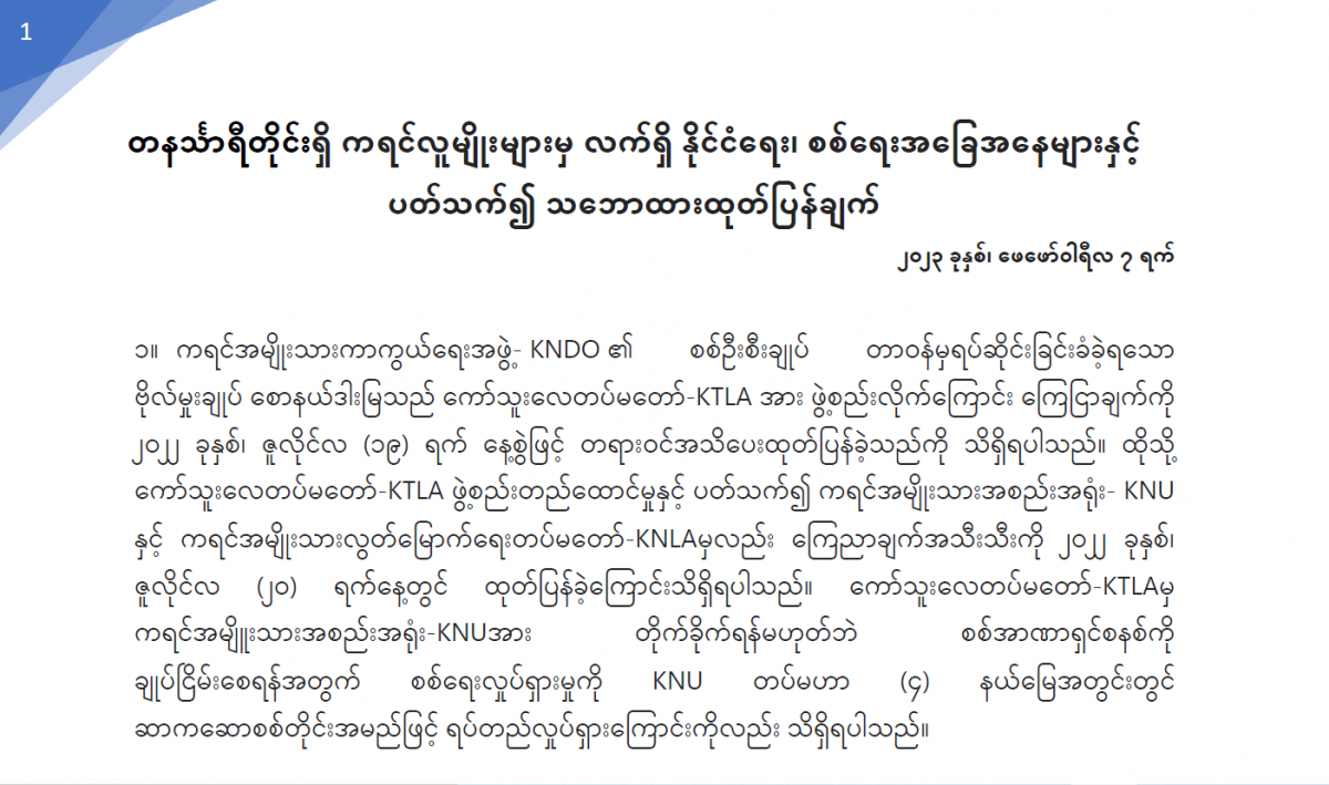 ကရင်အမျိုးသားအစည်းအရုံး-KNU၊ တပ်မဟာ (၄) နယ်မြေအတွင်းဖြစ်ပွားနေသည့် ကော်သူး လေအာမီ(KTLA) နှင့် KNU တပ်မဟာ (၄)တို့အကြား ပဋိပက္ခ တင်းမာမှုများကို လက်နက်ကိုင် ဖြေရှင်ကြခြင်းမပြုရန် တနင်္သာရီတိုင်းအတွင်းရှိ ကရင်ပြည်သူလူထုများက ယနေ့ ဖေဖော်ဝါရီလ ၇ ရက်နေ့ရက်စွဲဖြင့် ထုတ်ပြန်တောင်းဆိုလိုက်သည်။