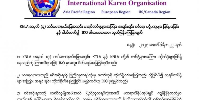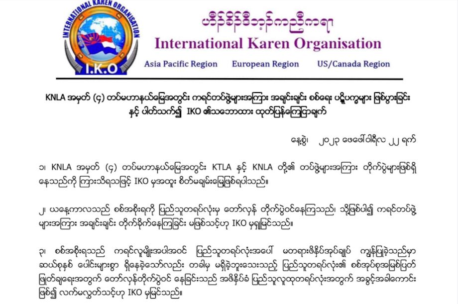 ကရင်တစ်မျိုးသားလုံး၏ မျက်နှာကိုထောက်ရှုသည့်အနေဖြင့် လက်ရှိ ကေအဲန်ယူ-ကရင်အမျိုးသားအစည်းအရုံး ဘိတ်-ထားဝယ်ခရိုင်၊ တပ်မဟာ ၄ နယ်မြေတွင် ဖြစ်ပေါ်နေသည့် ကရင်လက်နက်ကိုင်အချင်းချင်းကြား တိုက်ခိုက်မှုကို အမြန်ဆုံး အဆုံးသတ်ပေးရန် နိုင်ငံတကာ ကရင်အဖွဲ့အစည်း- IKO က ယနေ့ ဖေဖော်ဝါရီလ ၂၂ ရက်နေ့တွင် သဘောထားထုတ်ပြန်ကြေညာချက်ထုတ်ကာ မေတ္တာရပ်ခံလိုက်သည်။