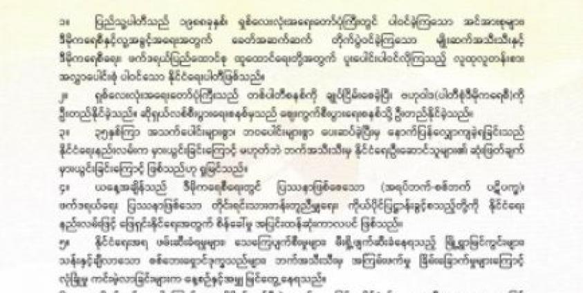 ဒါ့အပြင် တိုင်းဒေသကြီး ဒါမှမဟုတ် ပြည်နယ်တစ်ခုအတွင်းမှာသာ စည်းရုံးမယ့် နိုင်ငံရေးပါတီ ၈ ခုအထိ ရှိပြီး အဲဒီပါတီတွေကို တည်ထောင်ခွင့်နဲ့ မှတ်ပုံတင်ခွင့်ပြုနိုင်ရေး ပြည်ထောင်စုရွေးကောက်ပွဲကော်မရှင်က စိစစ် ဆောင်ရွက်နေတယ်လို့ ဆိုထားပါတယ်။