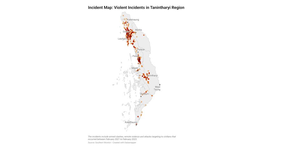 Southern Monitor က ပြုစုထားသည့် အချက်အလက်များအရ တနင်္သာရီတိုင်းအတွင်းတွင် ၂၀၂၁ ခုနှစ်၊ ဖေဖော်ဝါရီလကနေ ၂၀၂၃ ခုနှစ် ဖေဖော်ဝါရီလအထိ တိုက်ပွဲ ၃၅၈ ကြိမ်ဖြစ်ပွားခဲ့သည်ဟု ထုတ်ပြန်ထားသည်။