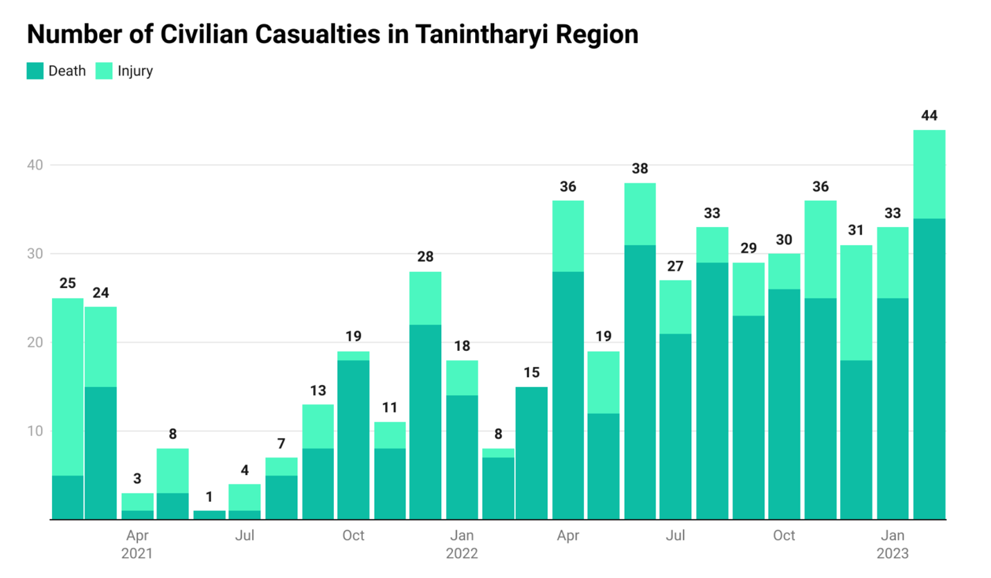 တနင်္သာရီတိုင်းဒေသကြီးတွင် အရပ်သားသေဆုံးမှုတိုးလာပြီး ဖေဖော်ဝါရီတစ်လအတွင်း အရပ်သားသေဆုံးမှု ၃၄ ဦးရှိခဲ့သည်ဟု Southern Monitor က ထုတ်ပြန်ထားသည့် အချက်အလက်များအရ သိရသည်။
