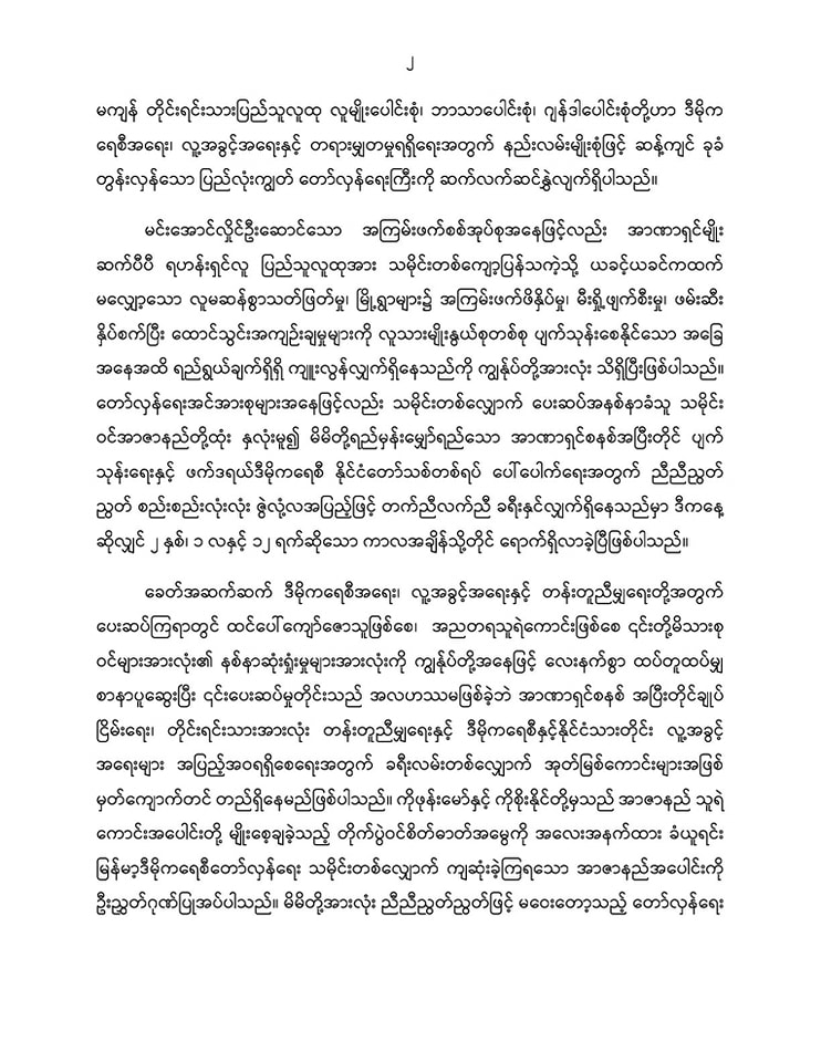 ခေတ်အဆက်ဆက် ဒီမိုကရေစီရေး၊ လူ့အခွင့်အရေးနဲ့ တန်းတူညီမျှရေးတို့အတွက် ပေးဆပ်ကြသူ တွေဟာ ထင်ပေါ်ကျော်ဇောသူဖြစ်စေ၊ အညတရသူရဲကောင်းဖြစ်စေ၊သူတို့ရဲ့ မိသားစုဝင်တွေ အားလုံးရဲ့ နစ်နာဆုံးရှုံးမှုအားလုံးကို လေးနက်စွာ ထပ်တူထပ်မျှစာနာပူဆွေးပြီး ပေးဆပ်မှုတိုင်း အတွက် အလဟဿမဖြစ်ခဲ့ဘဲ အာဏာရှင်စနစ်အပြီးတိုင် ချုပ်ငြိမ်းရေး၊တိုင်းရင်းသားအားလုံး တန်းတူညီမျှရေး၊ ဒီမိုကရေစီရေးနဲ့ နိုင်ငံသားတိုင်း လူ့အခွင့်အရေးတွေ အပြည့်အဝ ရရှိစေရေး အတွက် ခရီးလမ်းတလျှောက် အုတ်မြစ်ကောင်းတွေအဖြစ် မှတ်ကျောက်တင်တည်ရှိနေမှာ ဖြစ်တယ်လို့ ဆိုထားပါတယ်။