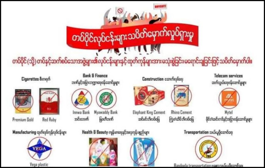 တနင်္သာရီတိုင်းဒေသကြီး၊ ထားဝယ်မြို့နယ်နှင့် အရှေ့တော ဒေသရှိ ဒေသခံပြည်သူများအနေဖြင့် စစ်တပ် ထုတ်ကုန်များကို အသုံးမပြုကြရန် OAK AWE COLUMN DAWEI (ဥဩစစ်ကြောင်း ထားဝယ်မြို့နယ်)က မတ်လ ၁၁ ရက်နေ့တွင် ထုတ်ပြန်အသိပေးလိုက်သည်။