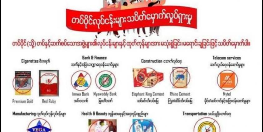 ဥဩစစ်ကြောင်း၏ ထုတ်ပြန်ချက်တွင် စစ်ကောင်စီထုတ်ကုန်ဖြစ်သော ဆေးလိပ်၊ ဘီယာ၊ စားသောက်ကုန်ပစ္စည်း တချို့ နှင့် ဆေးရုံ၊ ဟိုတယ်(Hotel)၊ ဘဏ် စသည်တို့အပါအဝင် အမျိုးအစား စုစုပေါင်း (၃၀)ကျော်ပါဝင်ကြောင်း ဖော်ပြထားသည်။