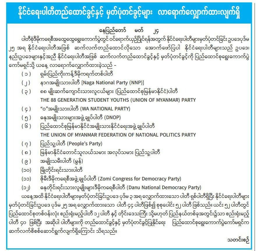 ပြည်ထောင်စုတဝန်းစည်းရုံးမယ့်ပါတီ ၁၂ ပါတီနဲ့ တိုင်းဒေသကြီး ဒါမှမဟုတ် ပြည်နယ်တစ်ခုမှာသာ စည်းရုံးမယ့် ပါတီ ၄၀ ဖြစ်ပြီး အဲဒီပါတီတွေကို တည်ထောင်ခွင့်နဲ့ မှတ်ပုံတင်ခွင့်ပြုနိုင်ရေး UEC က ဆက်လက်စိစစ်နေတယ်လို့ ဆိုပါတယ်။