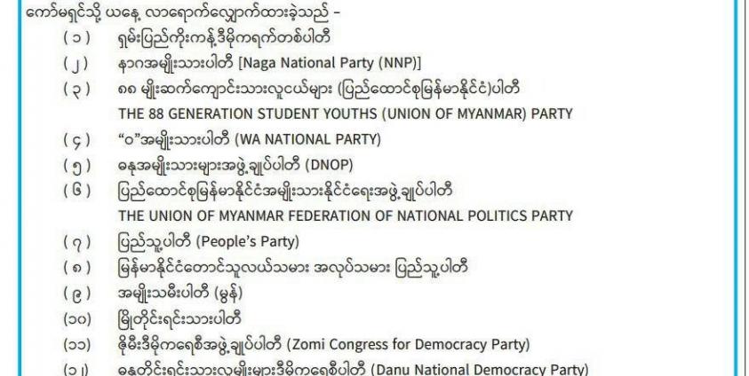 အလားတူ ပြည်ထောင်စုမြန်မာနိုင်ငံ အမျိုးသားနိုင်ငံရေးအဖွဲ့ချုပ်ပါတီ၊ပြည်သူ့ပါတီ၊အမျိုးသမီးပါတီ(မွန်)၊ မြိုတိုင်းရင်းသားပါတီ၊ မြန်မာနိုင်ငံတောင်သူလယ်သမား အလုပ်သမား ပြည်သူ့ပါတီ၊ ဇိုမီးဒီမိုကရေစီအဖွဲ့ချုပ်ပါတီနဲ့ ဓနုတိုင်းရင်းသားလူမျိုးများ ဒီမိုကရေစီပါတီတို့လည်း ပါဝင်ပါတယ်။