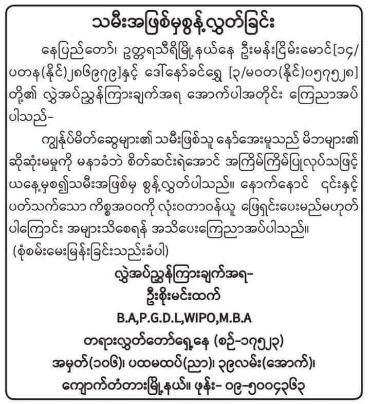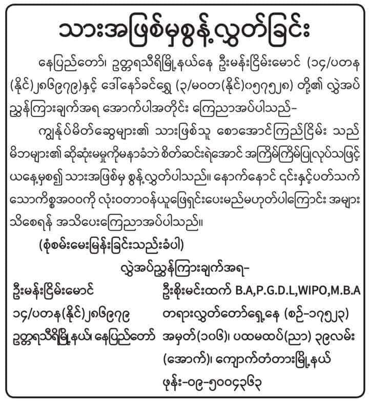 အဆိုပါသားနှင့်သမီးနှစ်ဦးသည် မိဘ၏ ဆိုဆုံးမမှုကိုမနာခံဘဲ စိတ်ဆင်းရဲအောင် အကြိမ်ကြိမ် လုပ် သည်ဟူ၍ သားသမီးအဖြစ်မှ စွန့်လွှတ်လိုက်ကြောင်းဆိုပြီး မန်းငြိမ်းမောင်၏ လွှဲအပ်ညွှန်ကြား ချက်အရ ၎င်း၏တရားလွှတ်တော်ရှေ့နေမှတစ်ဆင့် စစ်ကောင်စီထိန်းချုပ်သည့် သတင်းစာထဲတွင် ကြေငြာထားသည်ကို တွေ့ရှိရသည်။