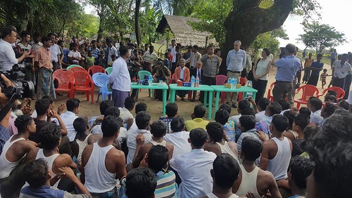 ကုလ ဒုတိယ အတွင်းရေးမှူးချုပ် မစ္စတာဂျက်ဖရီဖဲလ်မန်၏ ရခိုင်ခရီးစဉ်အတွင်း ဘင်္ဂလီများနှင့် အဓိက တွေ့သွားခဲ့။ ဓာတ်ပုံ- ဦးညီပု ဖေ့စ်ဘုတ်)