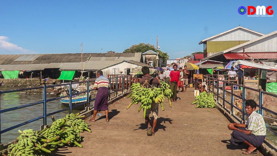 စစ်တွေဈေးကြီး ဆိပ်ကမ်းက အလုပ်သမားများကို နေပူထဲတွင် တွေ့ရစဉ်။ ဓာတ်ပုံ- DMG