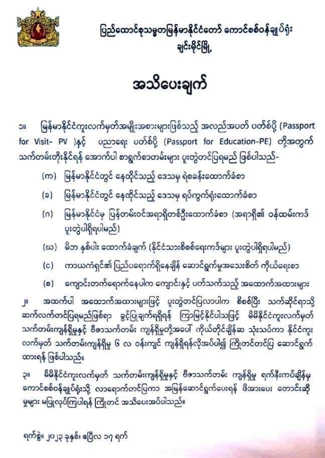 ထိုင်းနိုင်ငံမှာ တရားဝင်ဆက်နေထိုင်ဖို့ နိုင်ငံကူးလက်မှတ် သက်တမ်းတိုးတဲ့အခါမှာ နိုင်ငံကူးလက်မှတ် အမျိုးအစားတွေဖြစ်တဲ့ အလည်အပတ် ပတ်စ်ပို့ (PV) နဲ့ ပညာရေး ပတ်စ်ပို့ (PE) တို့ကို ထောက်ခံစာတွေကိုပါ ယူလာရမယ်လို့ ကောင်စစ်ဝန်ချုပ်ရုံးကနေ ဧပြီလ ၁၇ ရက်နေ့မှာ ကြေညာချက် ထုတ်ပြန်ခဲ့ပါတယ်။